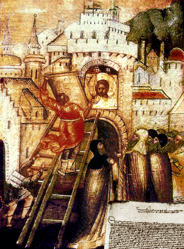 Edesa (actualmente en Turquía) era una ciudad impresionante, con más de 300 iglesias y monasterios, así como miles de ermitaños. Se convirtió así en uno de los principales centros de peregrinación, ya que, sostienen los autores, muchos acudían a contemplar la imagen conocida como Akeropita, que significa «no hecha por mano humana». También era conocida como tetradiplon, que se traduce como «doblado en cuatro», o más tarde como Mandylion, que significa «sudario».