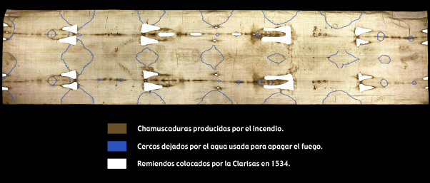 A pesar de las quemaduras y los remiendos, así como de los cercos dejados por el agua utilizada para extinguir el fuego, la imagen central ha permanecido prácticamente intacta. La doble impronta ha resistido inalterada a lo largo del tiempo, aunque lamentablemente se ha perdido parte de la zona correspondiente a los brazos. Las manchas visibles a lo largo del perímetro de la Sábana, entre el rostro y la nuca, así como entre el pecho y las rodillas, son un recordatorio del impacto del incendio.