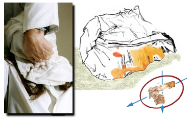 Las manchas puntiformes corresponden a la zona del lienzo que estuvo en contacto con el área occipital. Los coágulos se han concentrado, dejando un halo de suero alrededor. Esta sangre salió mientras el sujeto aún estaba vivo (ya que ha coagulado), quedando atrapada en el cabello y manchando la tela entre 45 y 60 minutos después de su salida.