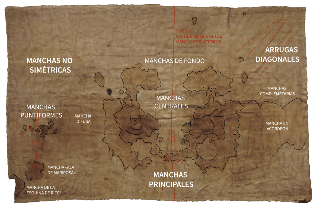 La primera mancha principal se encuentra sobre el foco y es compatible con las dimensiones de un rostro humano. Estas manchas debieron formarse sobre una superficie tridimensional (presumiblemente un rostro), lo que implica que no pueden ser interpretadas en dos dimensiones, sino en tres. Se realizaron numerosas pruebas con voluntarios hasta que se comenzaron a encontrar coincidencias sólidas. Las arrugas de la tela sugieren la existencia de una prominencia en la zona de la nariz. La identificación de elementos anatómicos del rostro fue confirmándose a medida que se encajaban todas las piezas. El paño estaba ajustado a la cara; por ello, al estirarlo, se observa un aumento de dos centímetros, correspondiente al saliente de la nariz.