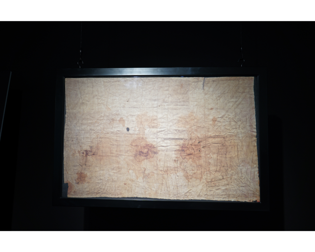 Se estudió un orificio oval que atraviesa de izquierda a derecha manteniendo una relación simétrica. Las costras oscuras observadas en los bordes de la quemadura producida por una vela durante una exploración rutinaria podrían ser restos de sangre. La técnica de transiluminación, que revela toda la densidad sanguínea, indica que la mancha se formó cuando el lienzo fue colocado doblado sobre la cabeza del cadáver en su primera posición.