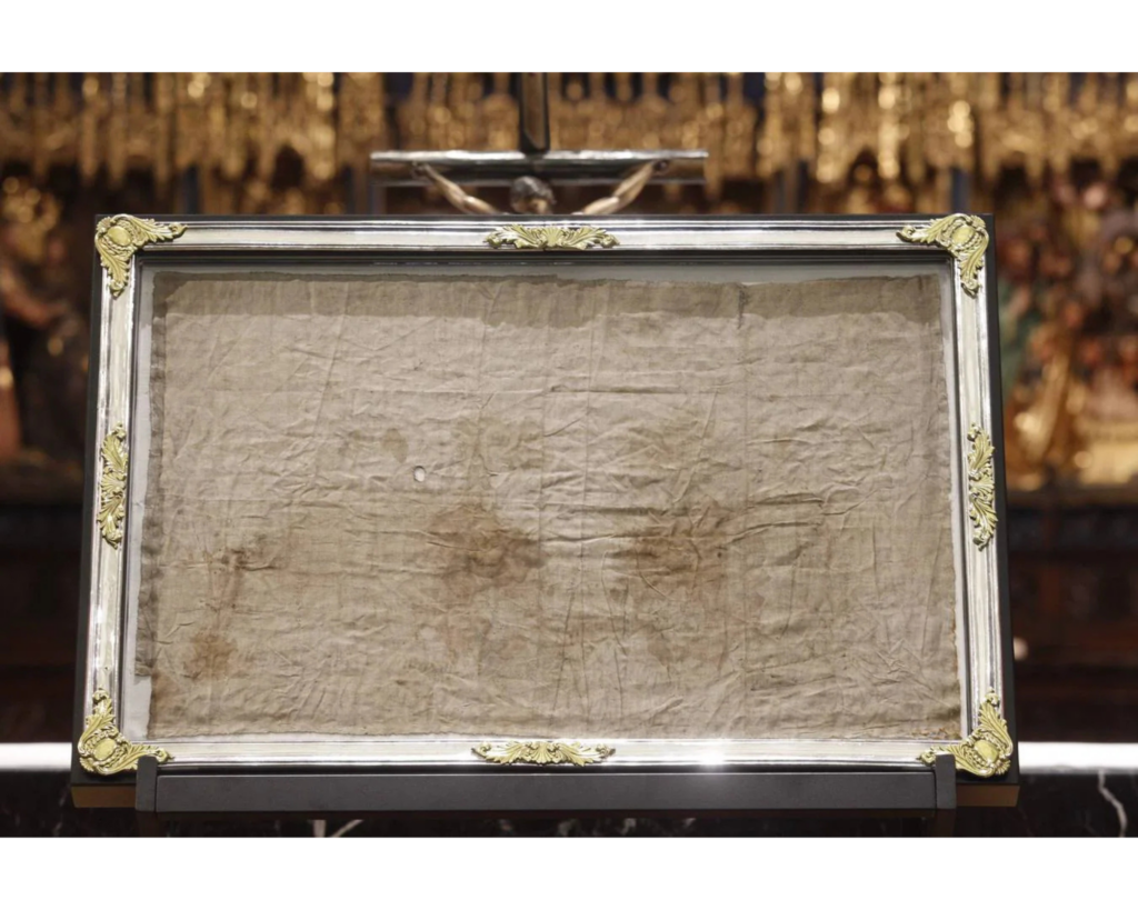 Además, se identificaron consecuencias derivadas de ciertos descuidos: según el análisis espectrográfico, en algún momento se colocó un recipiente con purpurina de plata sobre el Sudario, dejando manchas muy visibles. También se hallaron restos de carmín labial, lo que sugiere un acto de veneración hacia la reliquia.