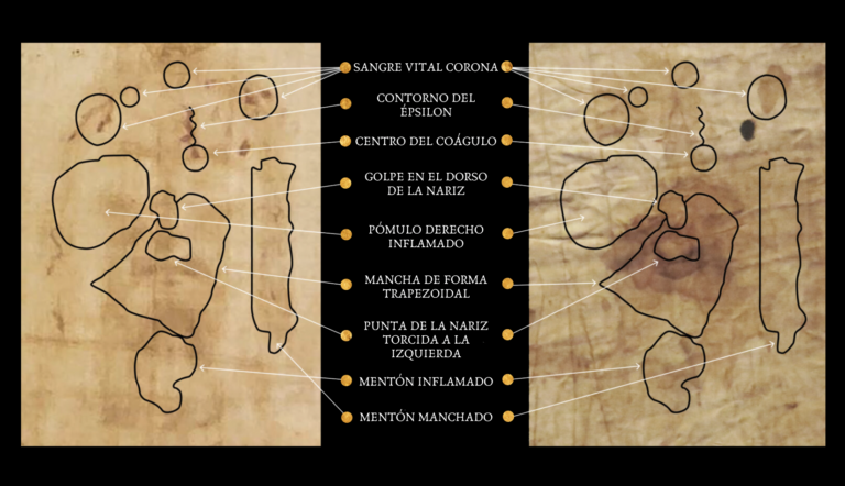 Además, se describieron las heridas visibles en ambos lienzos desde un enfoque forense, relacionándolas con la tortura sufrida por Jesús según los relatos evangélicos. Se determinó la correlación cualitativa entre ambas telas, identificando marcas duplicadas que podrían tener un origen común. Por último, se establecieron los niveles de correlación matemática, tanto lineal como angular, basándose en las nubes de puntos similares presentes en los dos lienzos.