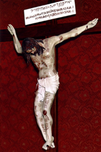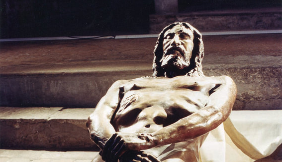 La escultura del forense Juan Manuel Miñarro está diseñada con una estatura que corresponde a los estudios antropométricos realizados sobre la Sábana Santa de Turín. El paño de pureza se adapta a la anatomía de las caderas, logrando un efecto dramático y realista mediante diversos recursos técnicos. La boca se representa semicerrada, el ojo izquierdo está parcialmente cerrado, mientras que el derecho está completamente ocluido por inflamación y edema palpebral. Además, la frente, la zona malar derecha, el dorso de la nariz y el mentón presentan traumatismos y heridas en relieve.
