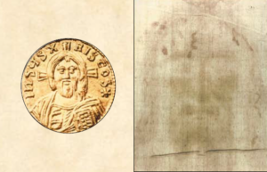 A partir del año 692, durante el reinado del emperador bizantino Justiniano II, se pueden encontrar imágenes de Cristo que presentan notables similitudes con la de la Sábana Santa en diversas monedas. Una moneda acuñada por el emperador Miguel III (842-867) reproduce el rostro de Cristo con un mechón de cabello sobre la frente, lo que probablemente representa el coágulo de sangre visible en la frente del hombre de la Sábana. A la izquierda, se muestra una comparación de imágenes superpuestas entre la moneda bizantina del emperador Miguel III y el icono de Cristo Pantocrator.