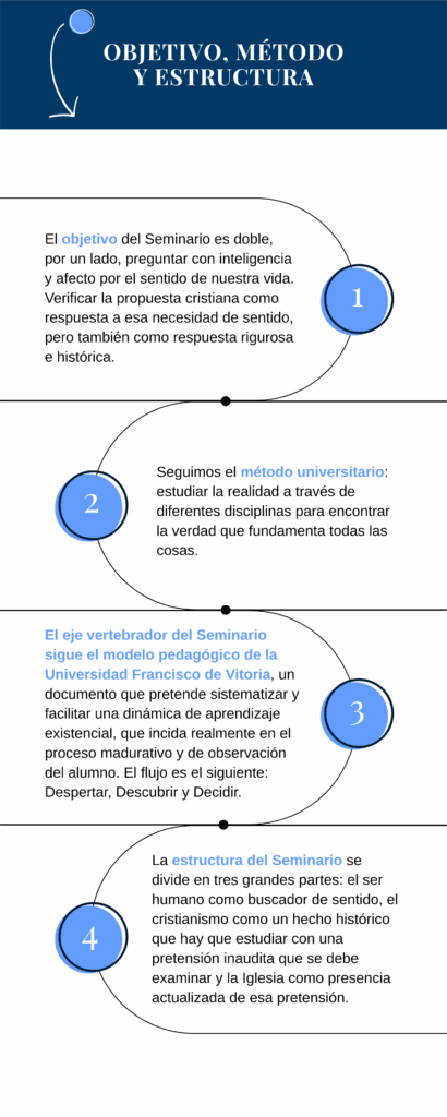 El objetivo del Seminario es doble, por un lado, preguntar con inteligencia y afecto por el sentido de nuestra vida. Desde las circunstancias, la biografía y el carácter de cada uno surgirán un tipo de preguntas u otras, con un acento o con otro, pero siempre apuntando al deseo de felicidad que tienen todos nuestros actos. Por otro lado, verificar la propuesta cristiana como respuesta a esa necesidad de sentido, pero también como respuesta rigurosa e histórica. En este sentido, nos preguntamos: ¿Es verdad que hubo un hombre que dijo ser Dios y cuya presencia sigue entre nosotros? ¿Puede una comunidad universitaria que utilice la razón creer y corroborar este dato?
