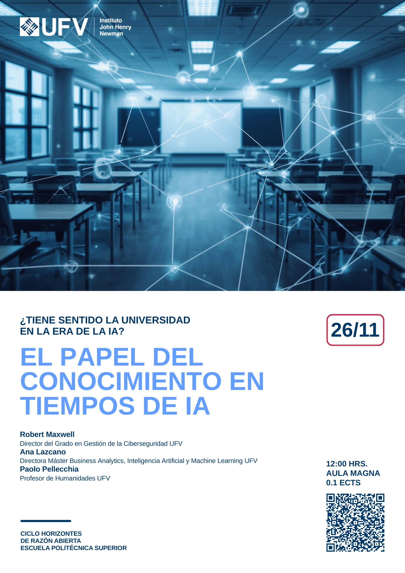 El Intituto Newman y la Escuela Politécnica Superior de la Universidad Francisco de Vitoria presentan este Ciclo Horizontes de Razón Abierta para preguntarnos por la pertinencia de la Universidad en un tiempo en el que la Inteligencia Artificial se desarrolla a pasos agigantados.
