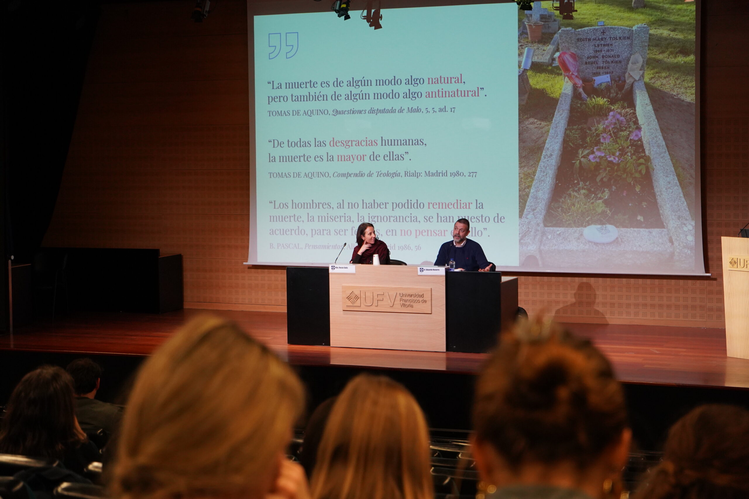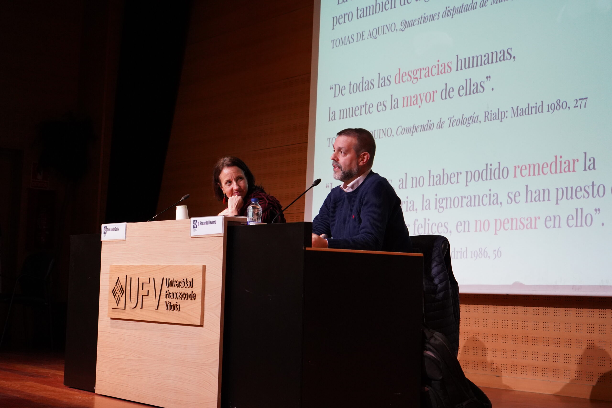 El profesor Eduardo Navarro impartió el Minicurso sobre la muerte trabajando el libro «Asumir lo efímero de la existencia«, de Viktor Frankl. Algunos de los temas clave de su exposición fueron la muerte como separación alma-cuerpo; la muerte como luz que ilumina la vida desde el final; la posibilidad de afirmar la vida pese a su carácter efímero; la distinción entre el tiempo como cronos y kairos; la persona como ser que busca el sentido; la crisis de sentido en nuestros días y la posibilidad de reconducir la vida hasta el último momento.
